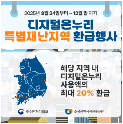 2025년 8월 24일부터 12월 말까지는 특별재난지역에서 디지털 온누리상품권 사용 시 추가 환급 혜택도 진행됩니다.