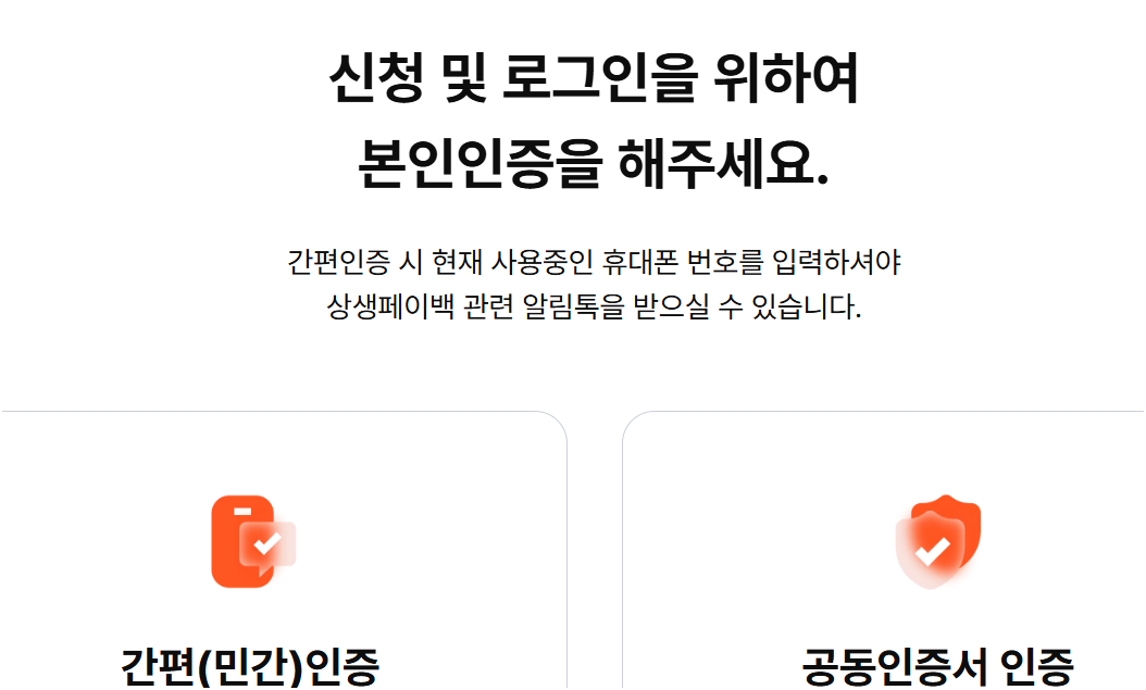 상생페이백 누리집 홈페이지에 접속해 본인 인증을 먼저 했습니다. 휴대폰 인증 또는 금융인증서를 통해 인증이 가능했고, 제가 이용한 방식은 간편인증이었어요.