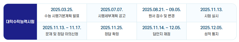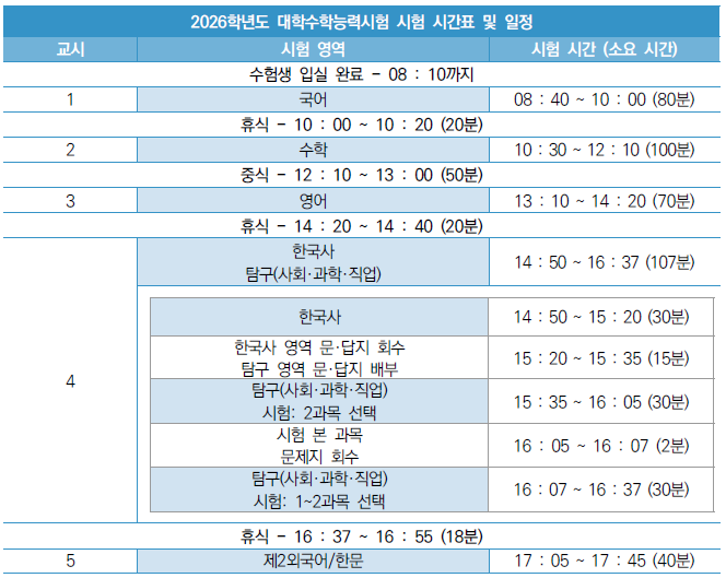 2026학년도 수능 및 모의평가 주요 일정 대학수학능력시험 2025.03.25. 수능 시행기본계획 발표 2025.07.07. 시행세부계획 공고 2025.08.21. ~ 09.05. 원서 접수 및 변경 2025.11.13. 시험 실시 2025.11.13. ~ 11.17. 문