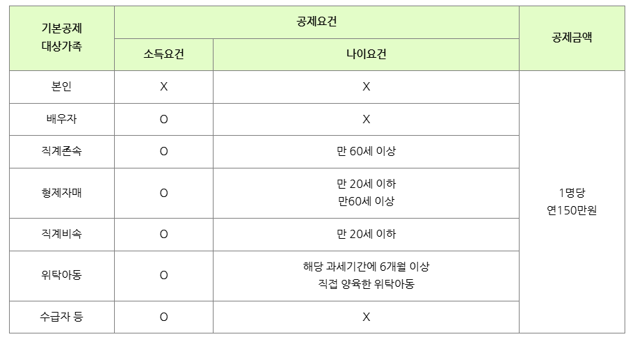 - 기본 원칙: 부양가족의 연간 소득금액 합계액이 100만 원 이하여야 합니다.