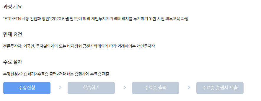 과정 신청: ‘한눈에 보는 레버리지 ETP(ETF·ETN) 가이드’ 과정을 선택합니다. 이 과정에는 미래에셋레버리지 etf 교육이나 코스닥레버리지 etf 등 모든 관련 상품에 공통 적용되는 기초 지식이 포함되어 있습니다.