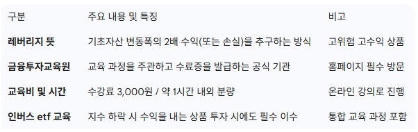 레버리지 및 인버스 2배(곱버스) 상품에 투자하기 위해서는 단순한 계좌 개설을 넘어 etf 교육이수가 법적 의무 사항입니다.