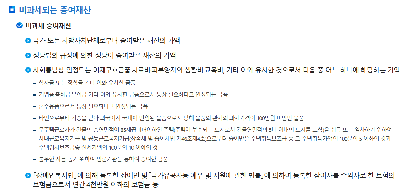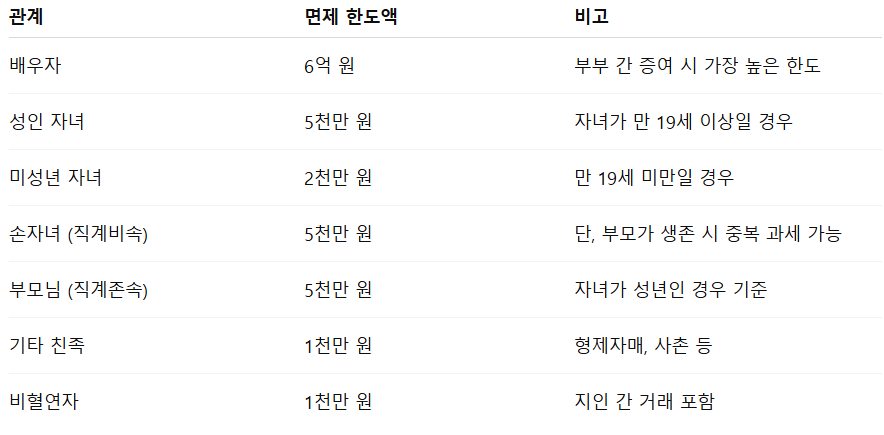 가족 관계에 따라 증여세가 부과되지 않는 범위가 다르게 정해져 있습니다.